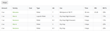 For all the weights provided, I use the above to make my decisions. I provide the percentages and estimated IBU so these can be adjusted accordingly for your personalization.